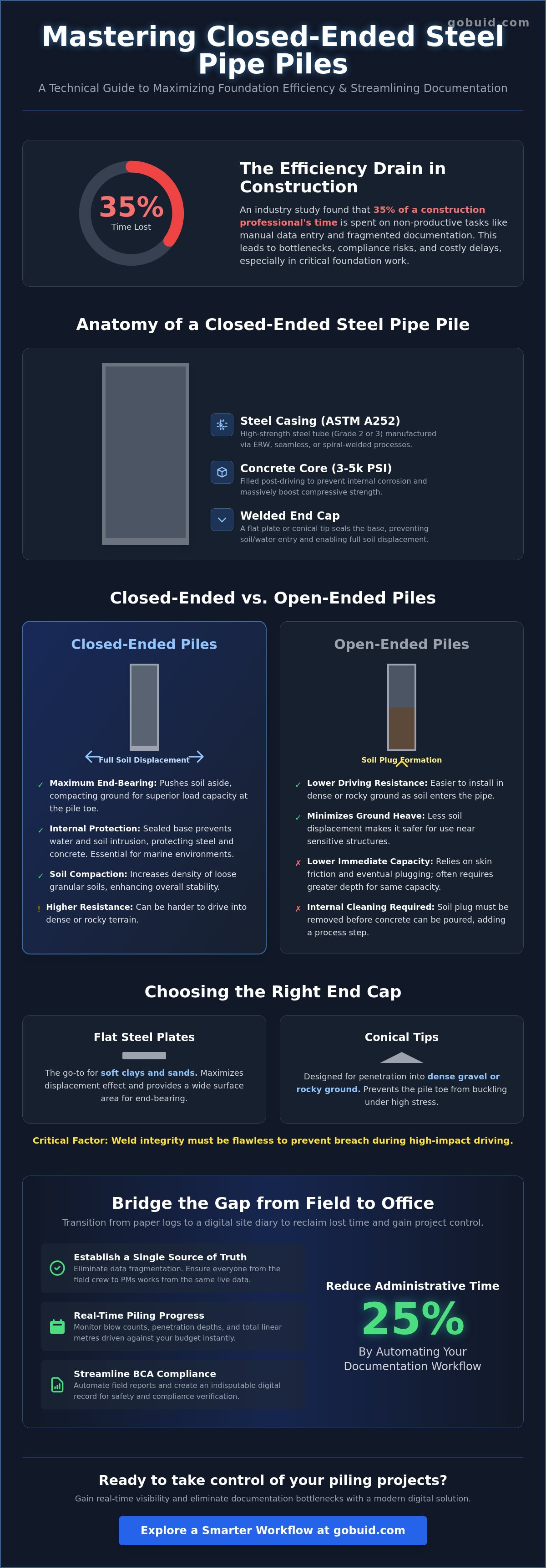 This guide provides the technical expertise you need to master Closed-Ended Steel Pipe Piles while showing you how to streamline your documentation for maximum project efficiency. We'll show you how to gain real-time visibility into your piling progress and reduce administrative time by up to 25%. We will explore the critical specifications of these piles, their specific load-bearing advantages, and the digital workflows that bridge the gap between the rugged job site and your final reports.