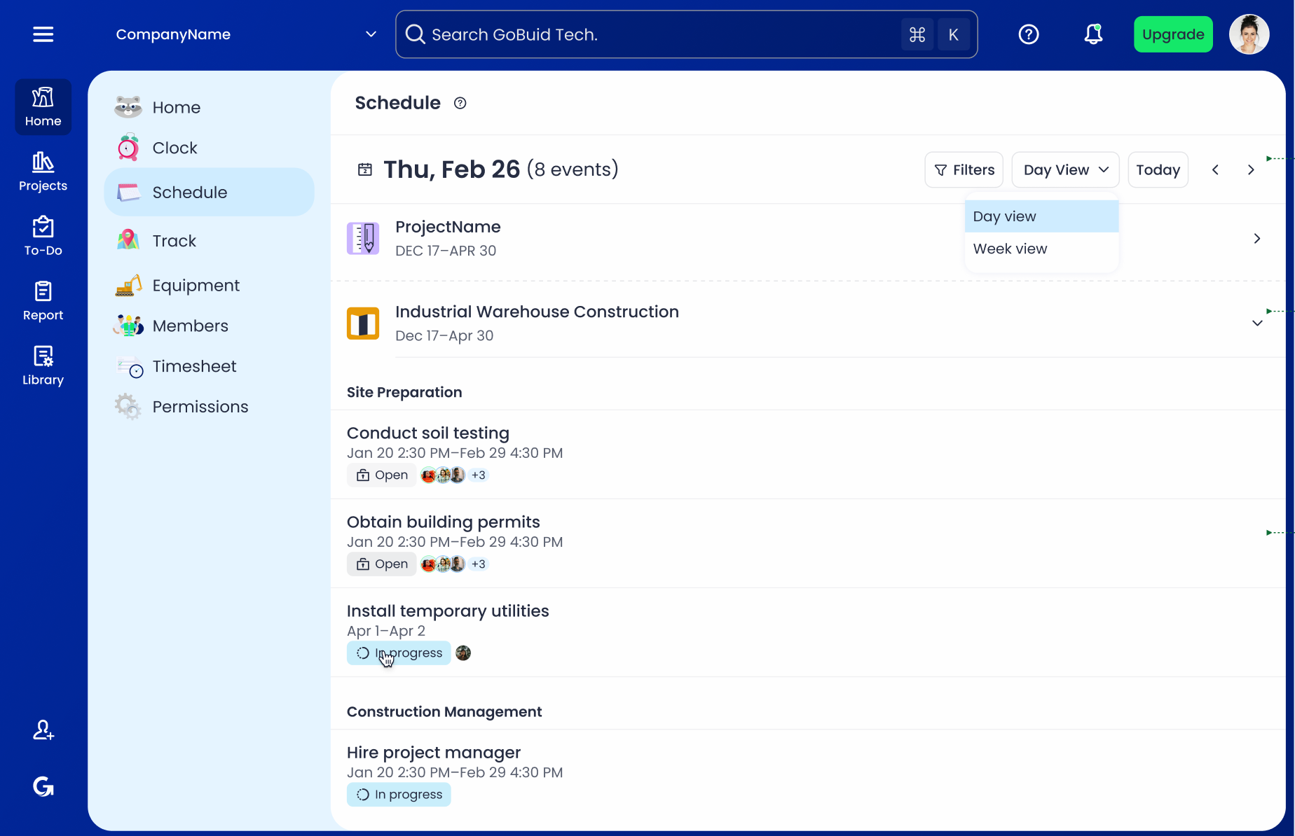 A calendar view is faster to scan than a long bar chart. GoBuid’s construction calendar lets you switch between daily and weekly views to match different needs. The daily view helps crews see exactly what’s planned for today. The weekly view gives managers and owners a clear look at upcoming work so they can anticipate handoffs, inspections, and resource needs in advance.
