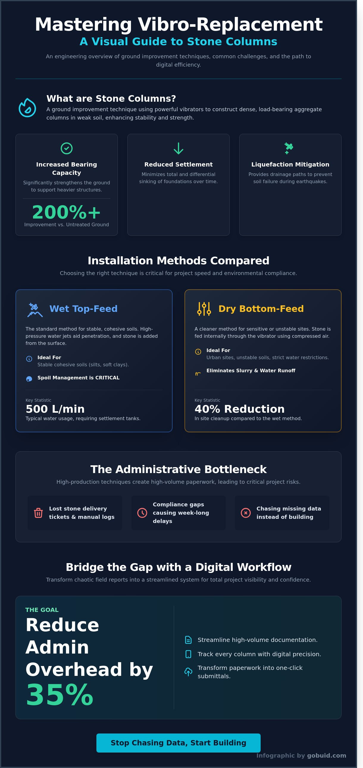This technical guide helps you master the mechanics of Vibro-Replacement (Stone Columns) while implementing a system that reduces administrative overhead by 35%. We'll show you how to transform chaotic field reports into a streamlined, digital workflow that satisfies every stakeholder and ensures total project visibility. We will break down the engineering fundamentals of stone columns and provide a tactical roadmap for bridging the gap between rugged site reality and the sleek precision of modern project management software.